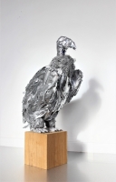 - " Vautour bestialu" /Technique mixtes (aluminium ménager, plumes, œil de verre, fourrure, acrylique, métal) / 76 x 52 x 30 cm (Socle bois compris).